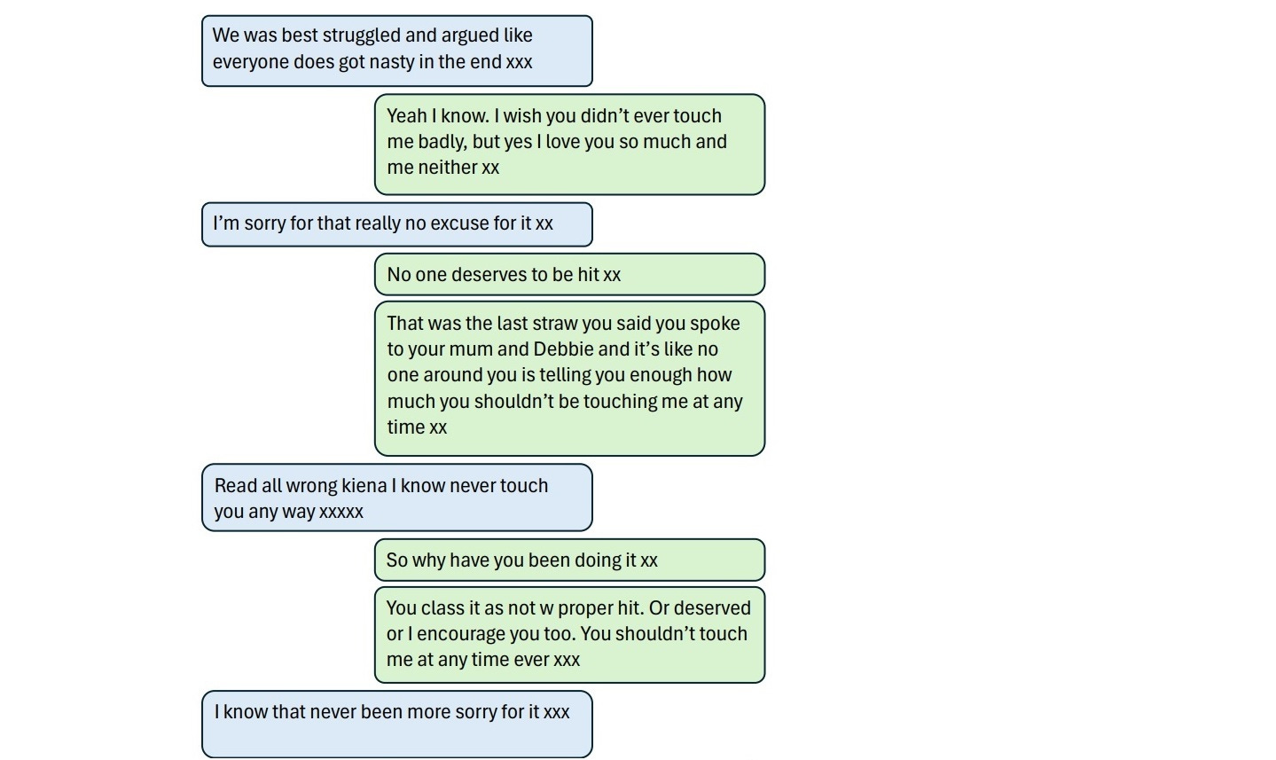 But within a similar timeframe he had also started his abusive behaviour and one of her messages to him read: “Stop hurting me now xxxxx.”