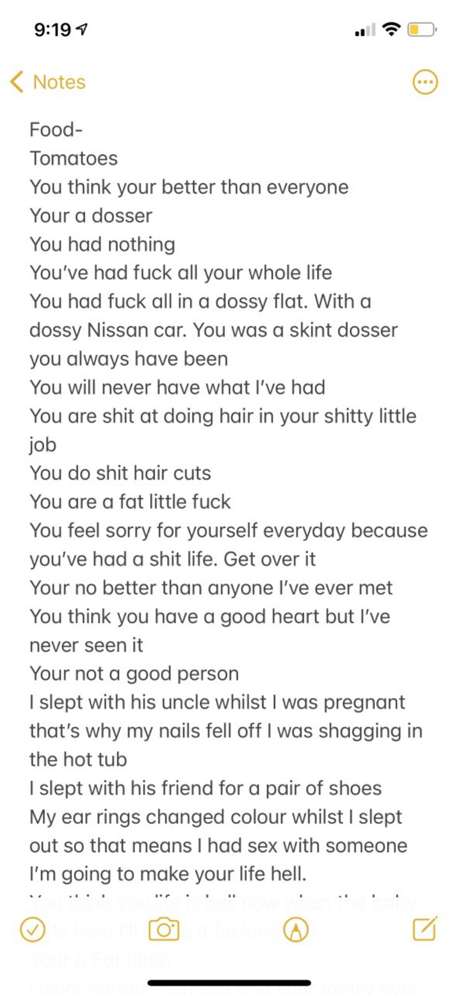 The pattern of abuse and apology would only continue and get worse. Kiena reported that an incident involving him dunking her head into a baby bath full of water left her suicidal and four days later she used the notes app on her phone to detail the abuse and threats.
