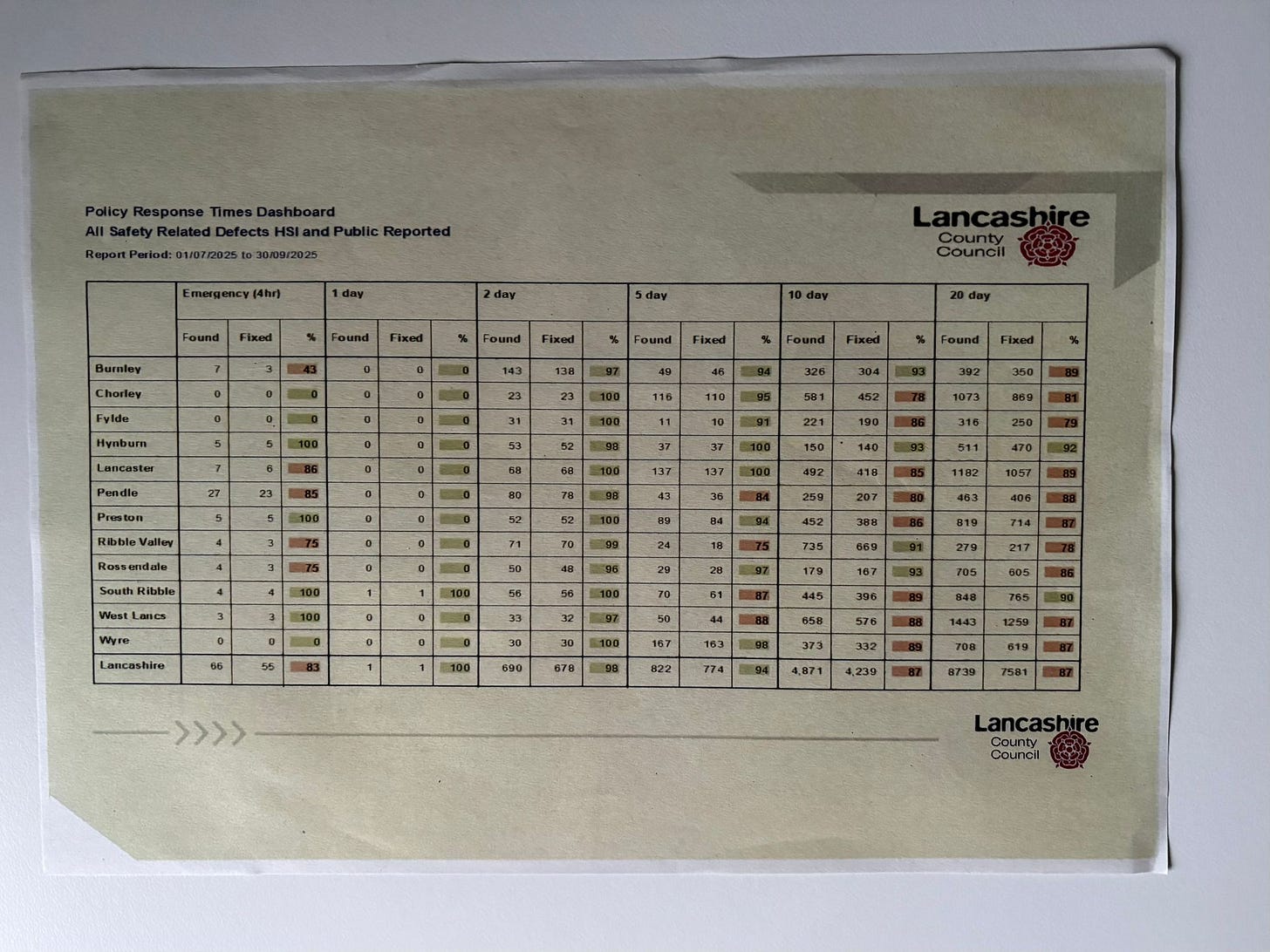 Lancashire County Council’s own target metrics task them with fixing 90% of defects within the classified times.