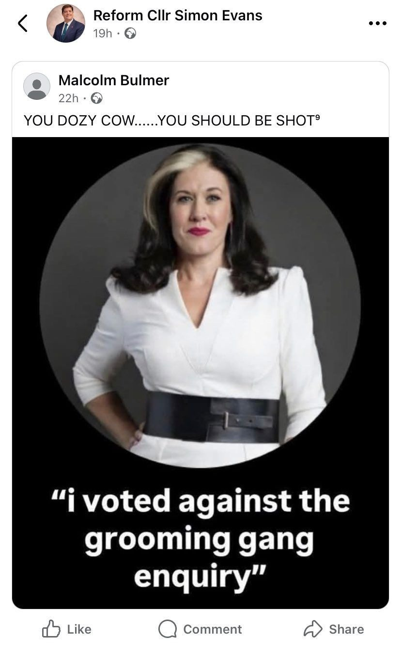 County Cllr Simon Evans reshared a post on Monday (23 February) on Facebook which showed an image of Natalie Fleet, Labour’s MP for Bolsover and who has spoken out about grooming gangs, with the caption “i voted against the grooming gang enquiry.”
