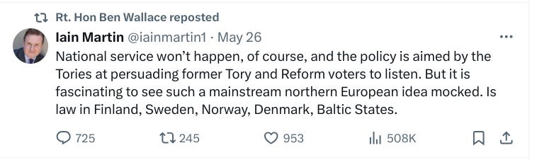 Meanwhile the aforementioned Ben Wallace has caused a fair bit of upset for commenting “heaven forbid young people are made to do something……” in relation to the national service plans. For me though, this retweet was far more of an eye-opener on his attitude to the proposal: