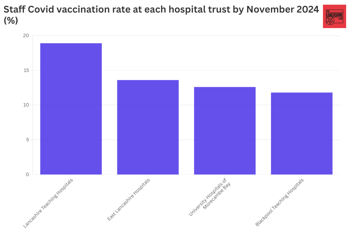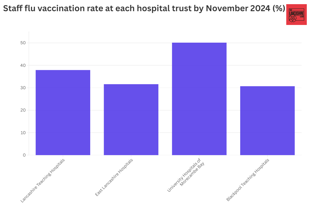 Only around a third of frontline staff in most Lancashire hospitals had received a flu vaccine prior to the recent surge in infections, according to the most recent figures.